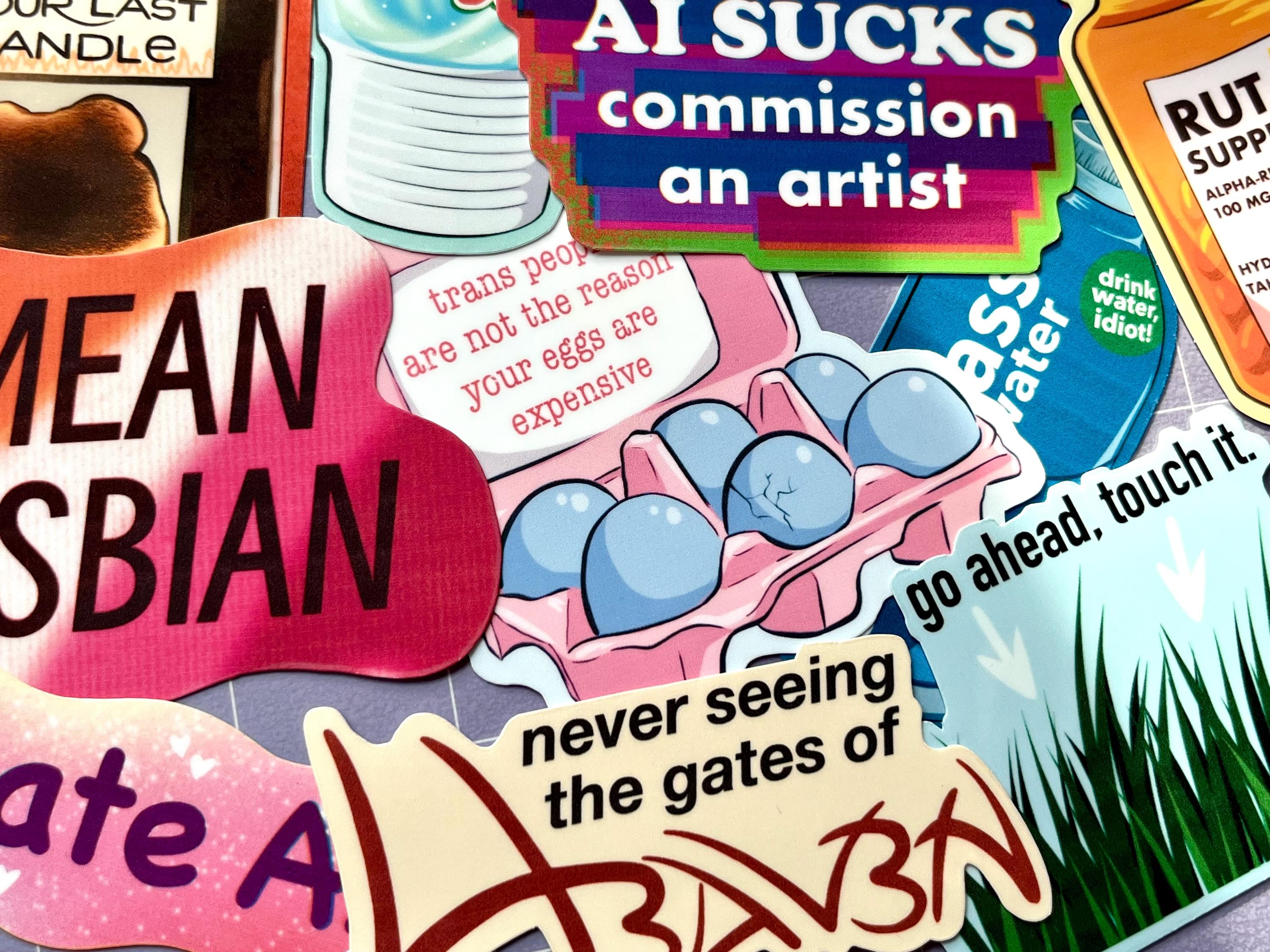 Printed on vinyl sticker paper and covered in waterproof glossy laminate.
