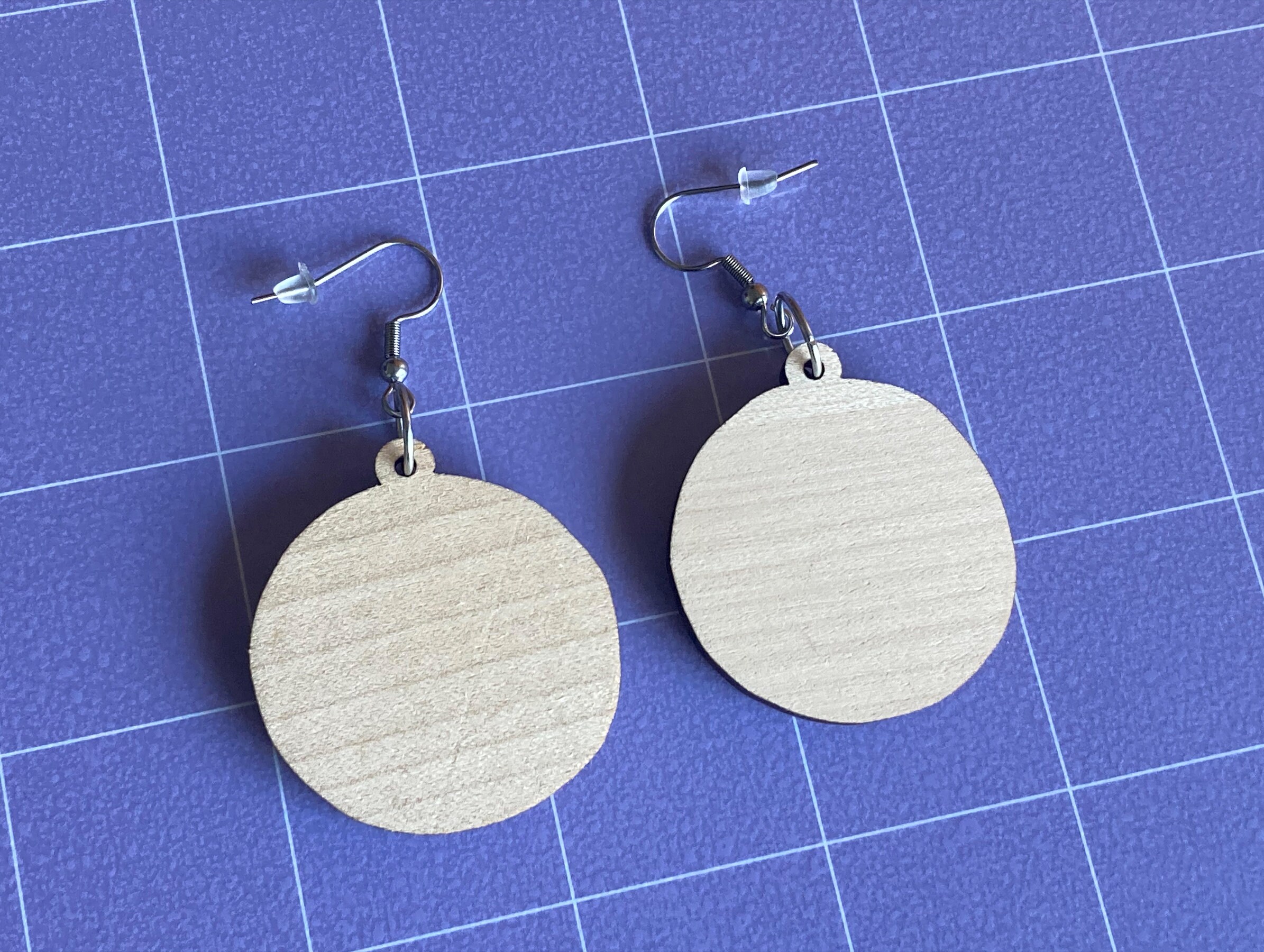Charms made from laser-cut maple wood. Charm designs are printed on one side of each earring charm.