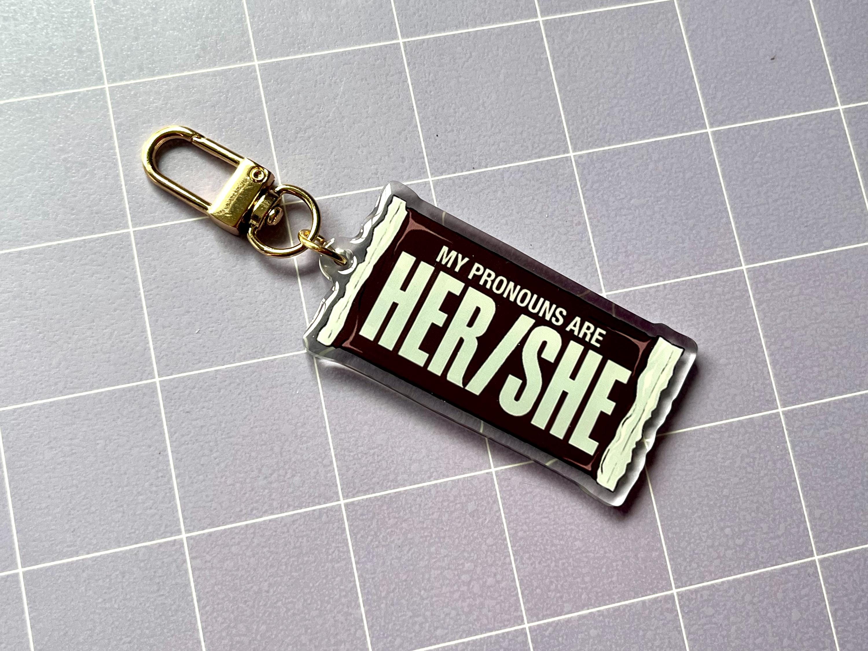 Her/She Chocolate Bar Pronouns 2.5" Acrylic Charm Keychain