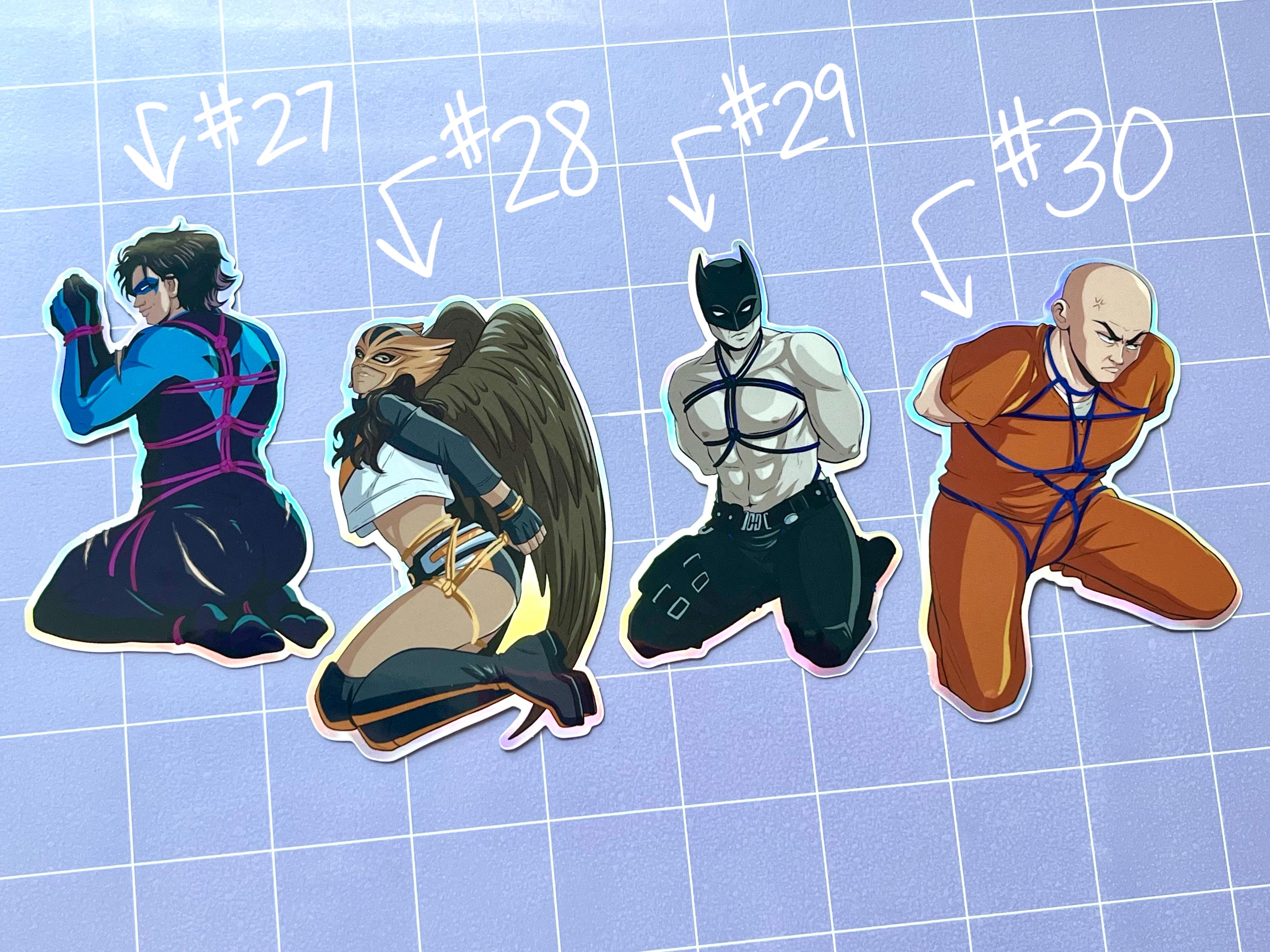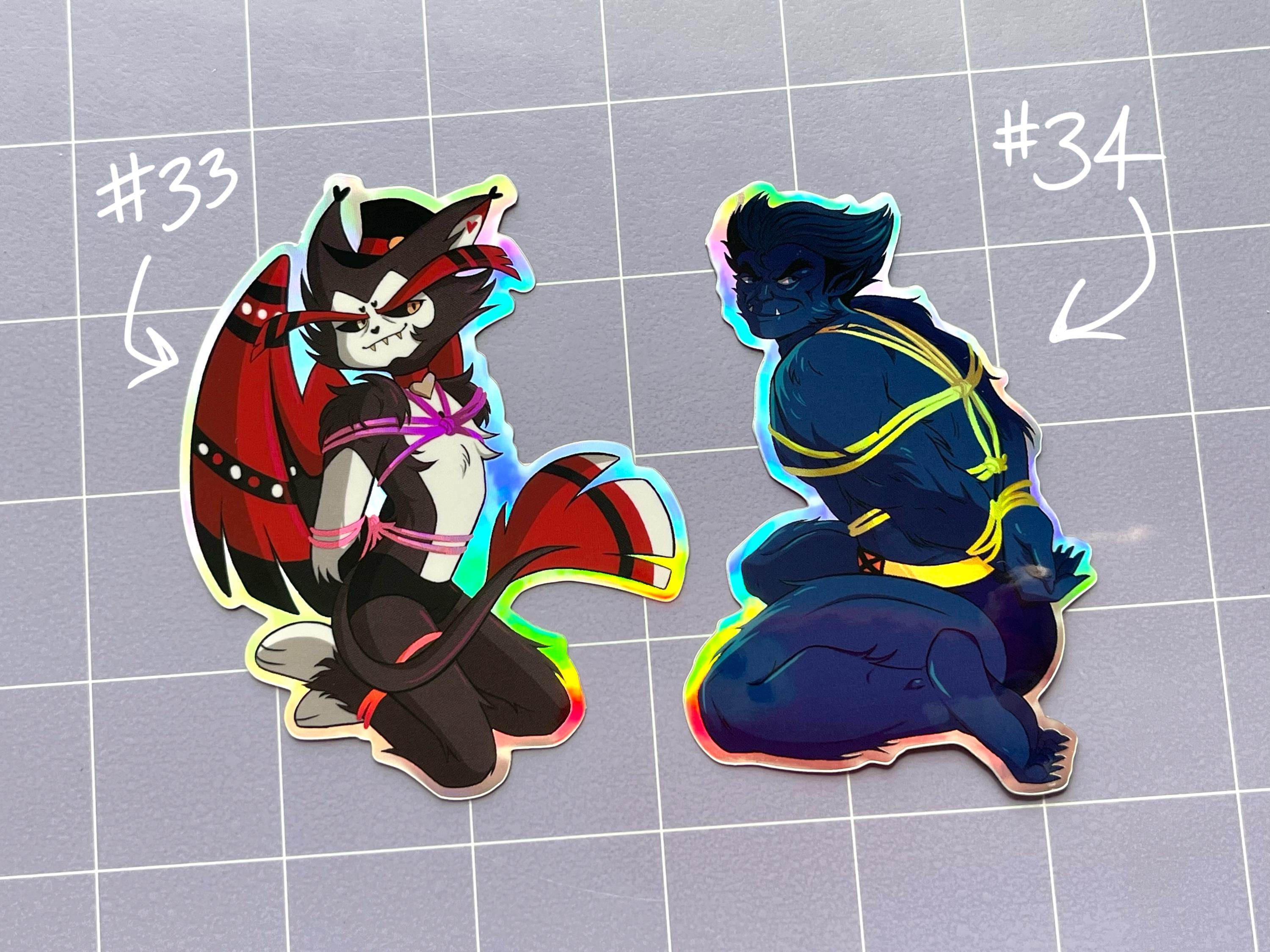 Selection of 3.5" holographic vinyl stickers inspired by some of your favorite characters, with a spicy twist!