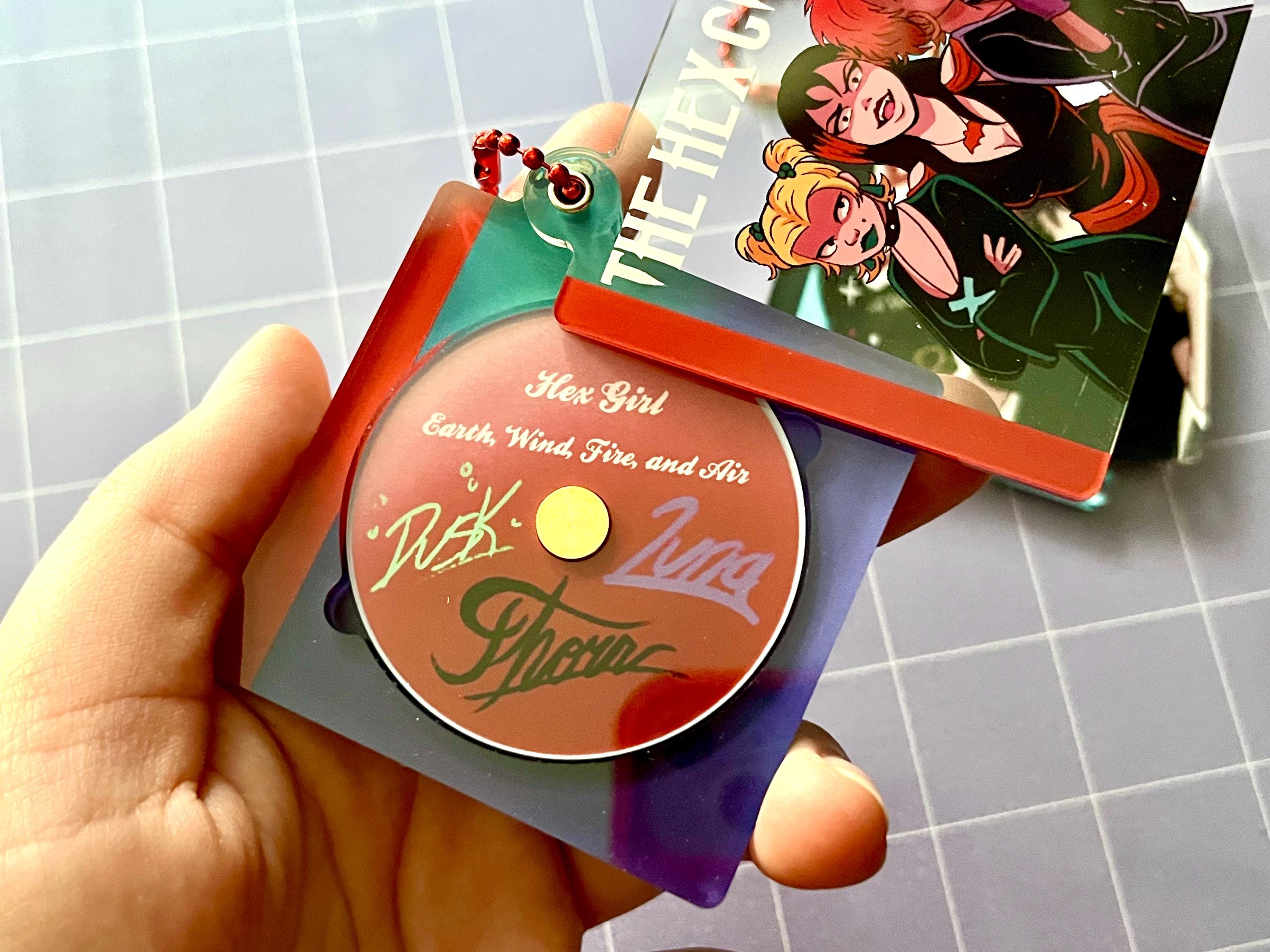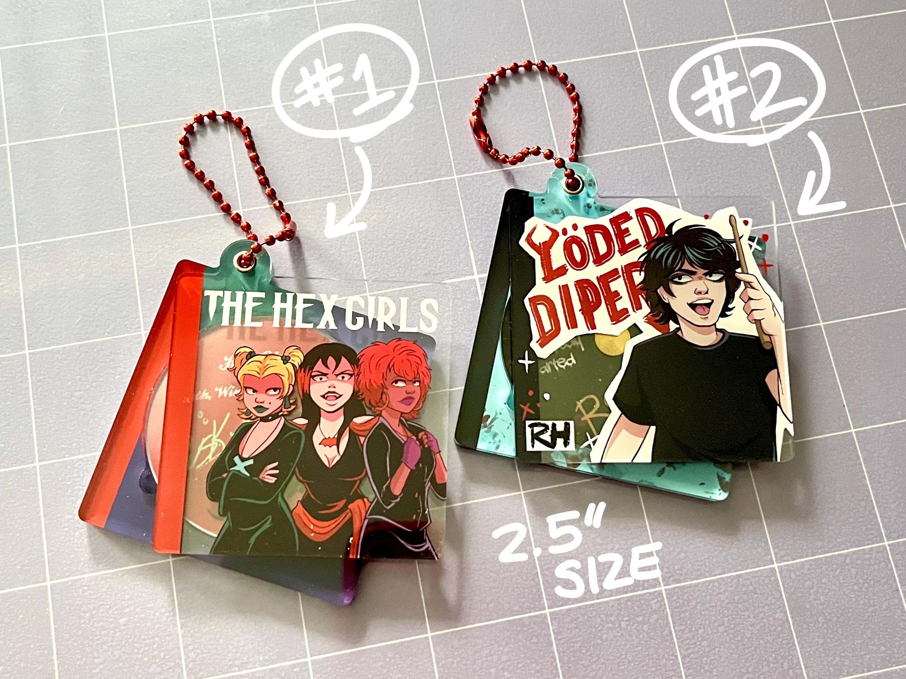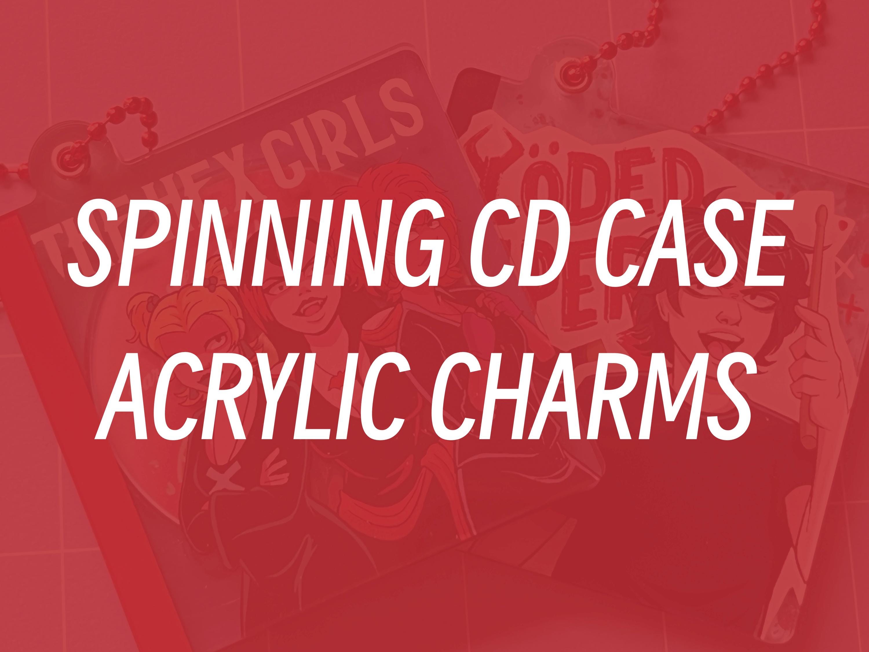 Acrylic charms designed to look like CD cases! Approximately 2.5" on each side, each includes a removable and spinnable acrylic CD piece inside. Features a red ball chain attachment.