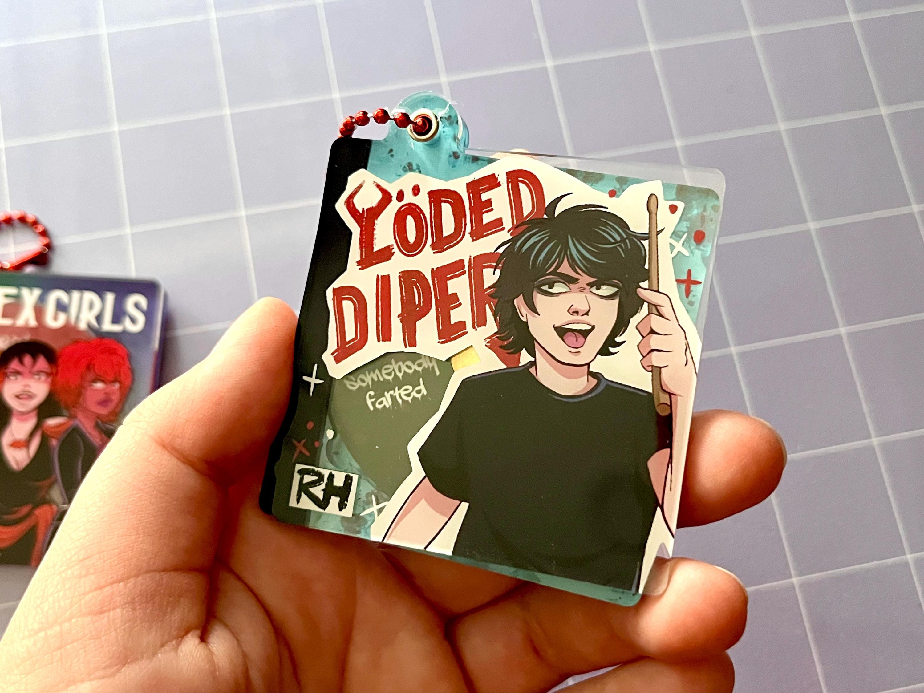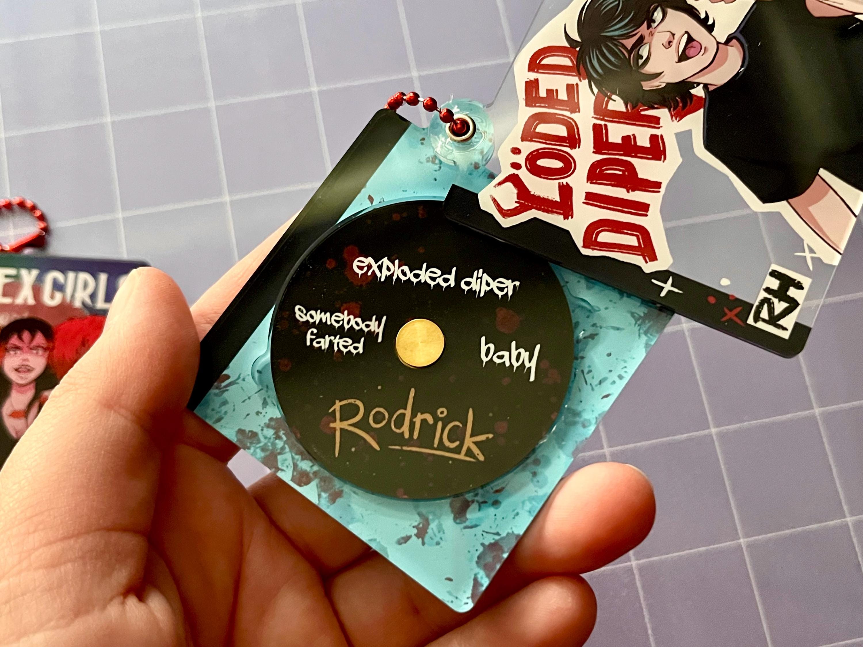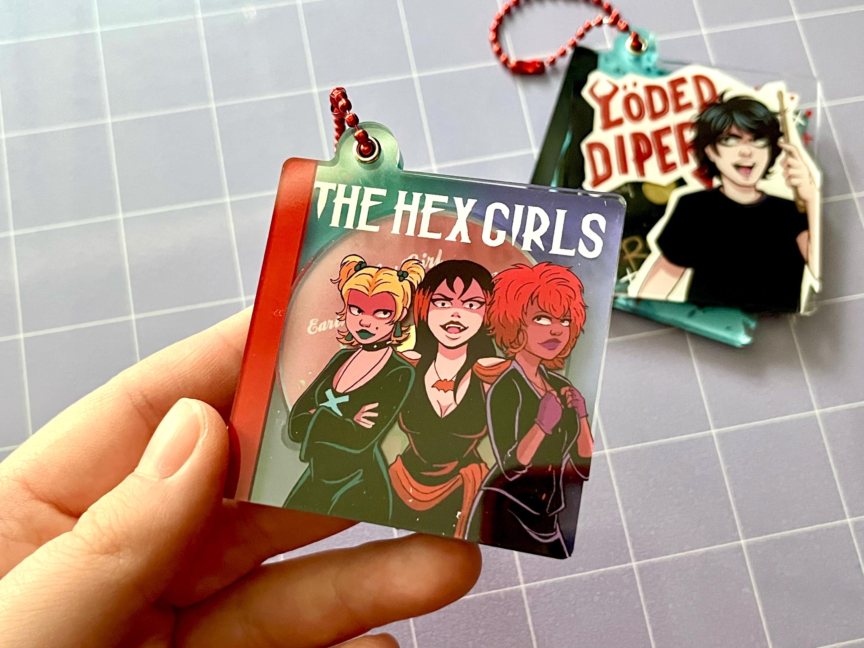 Acrylic charms designed to look like CD cases! Approximately 2.5" on each side, each includes a removable and spinnable acrylic CD piece inside. Features a red ball chain attachment.