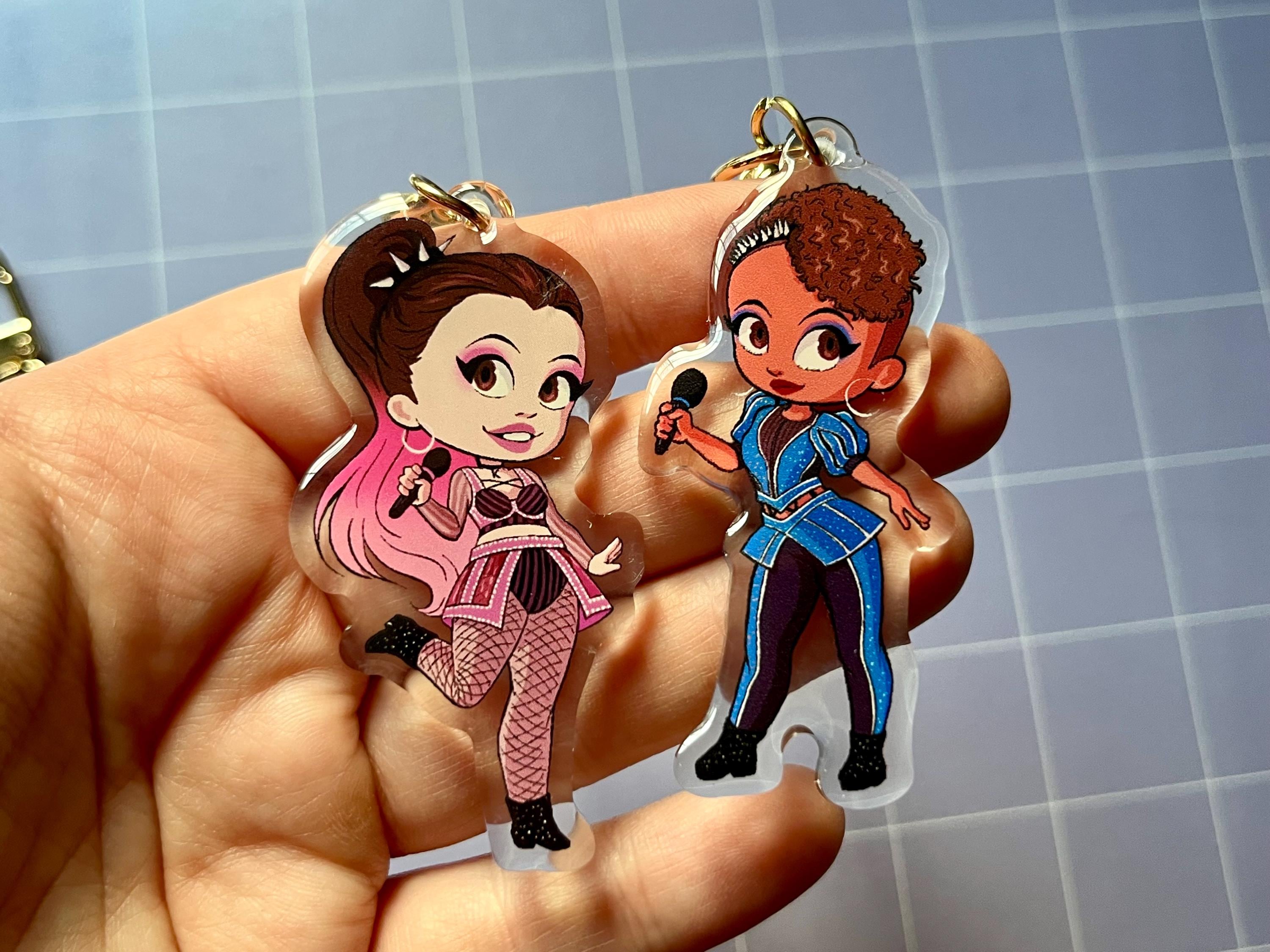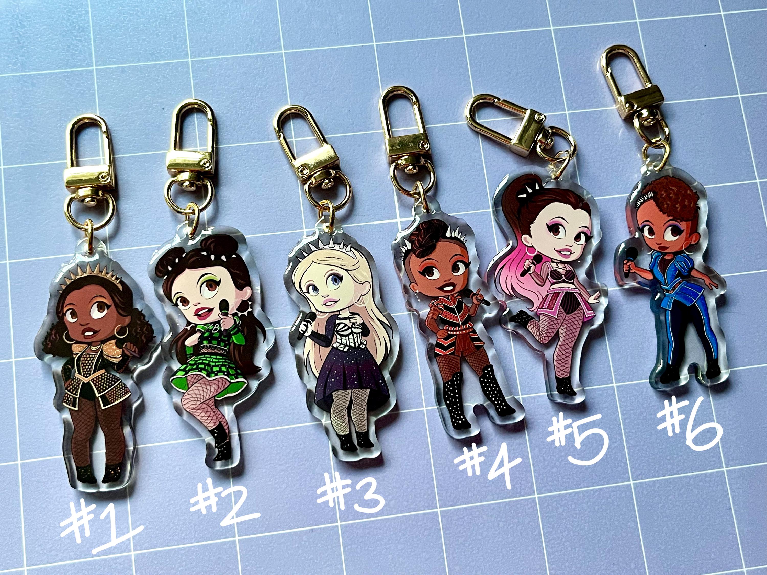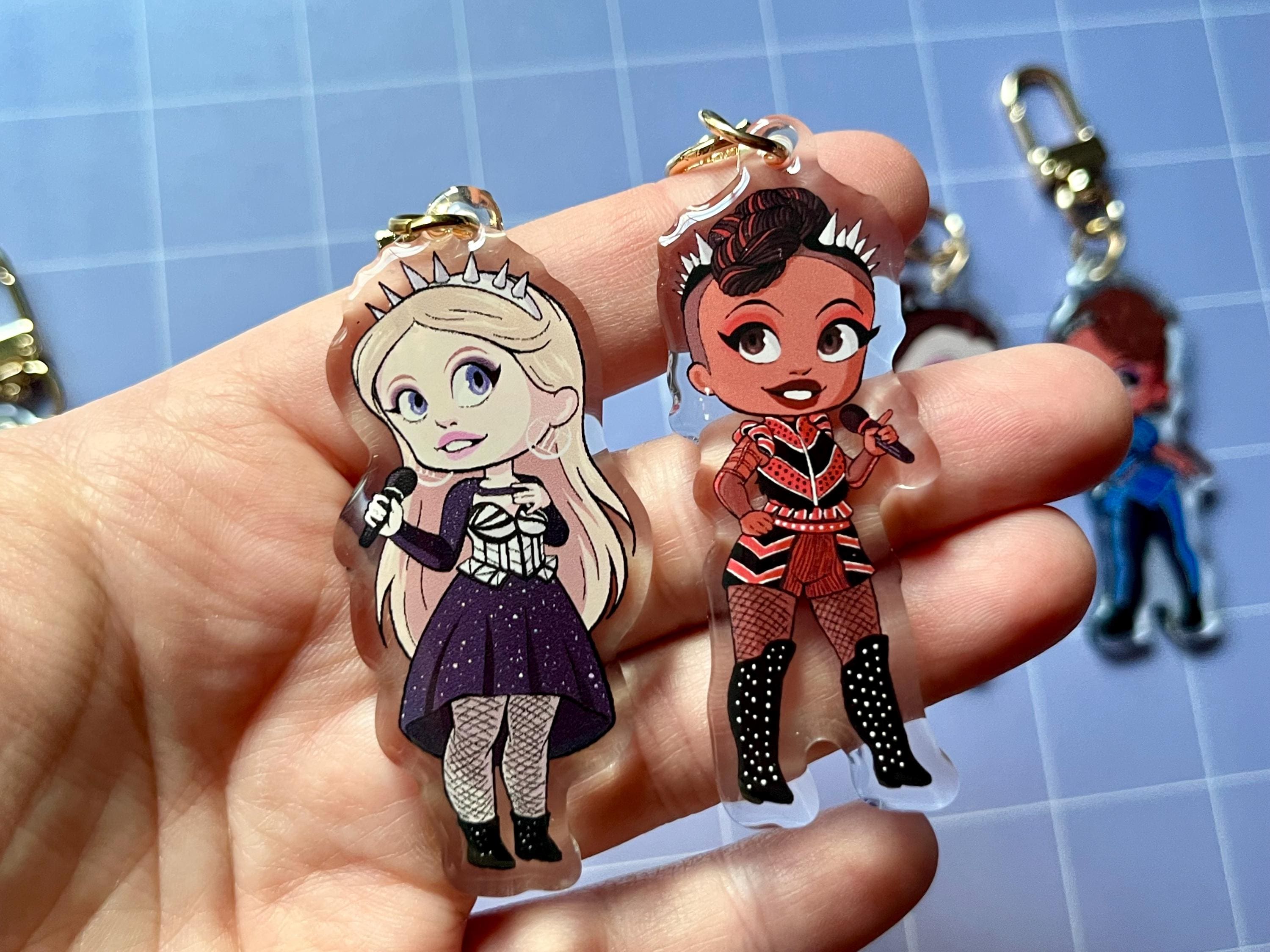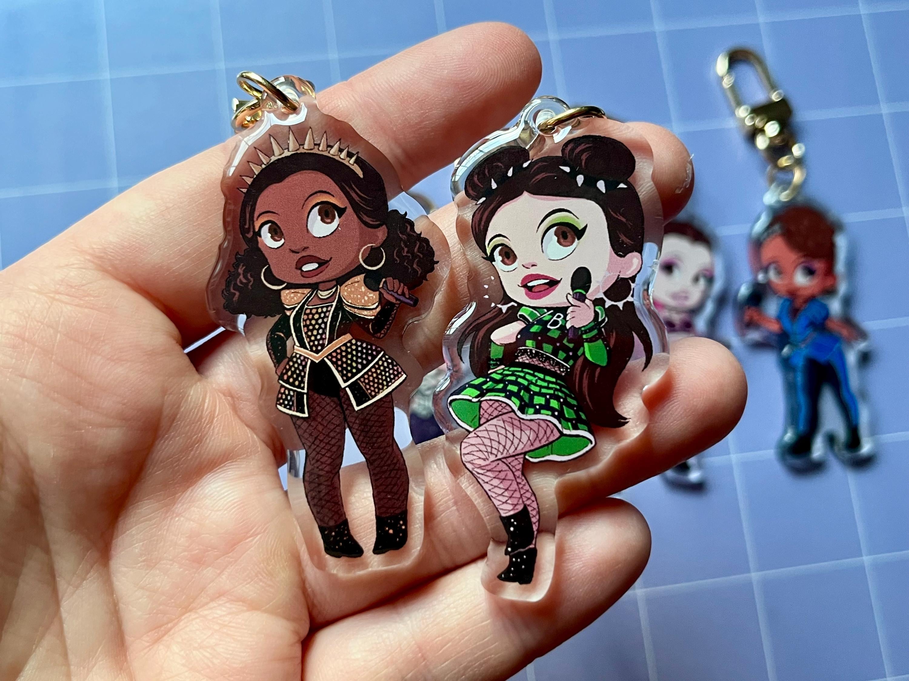 Selection of epoxy-coated acrylic keychains inspired by the hit musical. Features a gold-colored U-shaped clasp attachment. Epoxy coated on front side only. Design is printed on both sides.