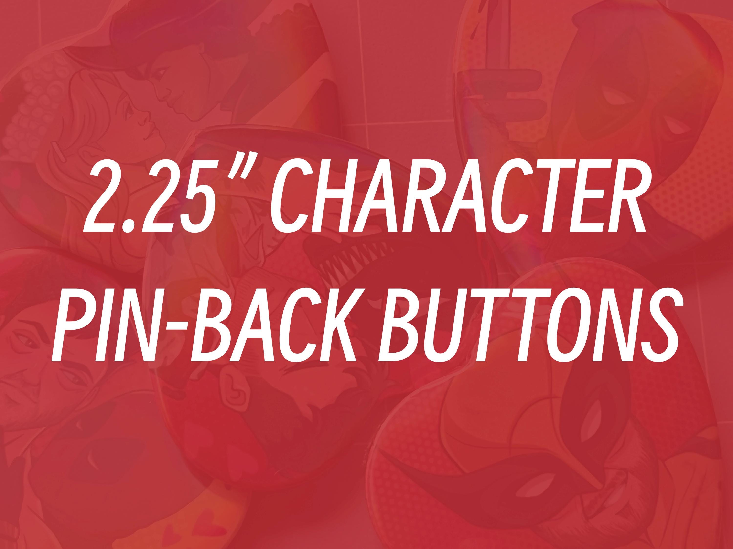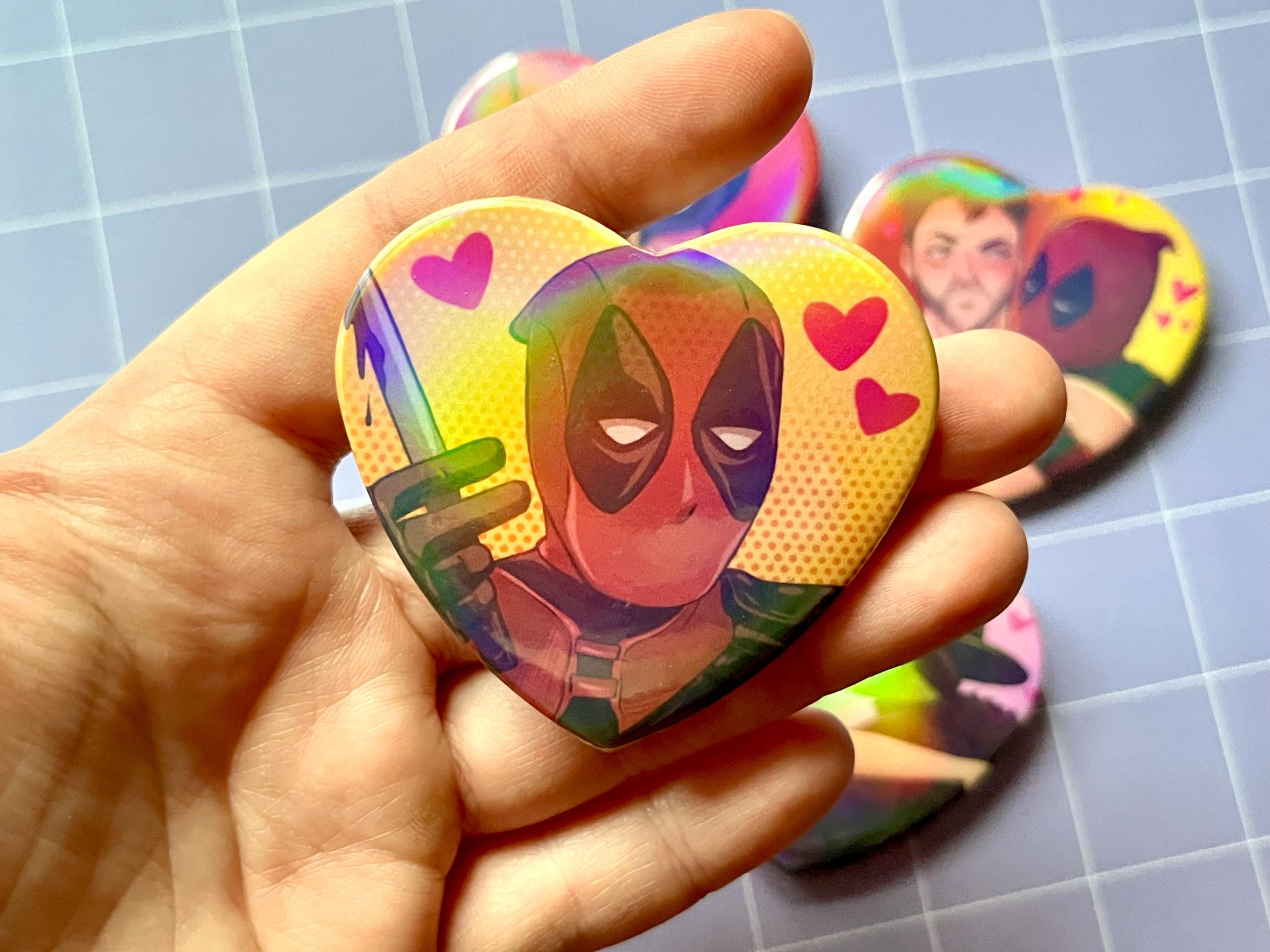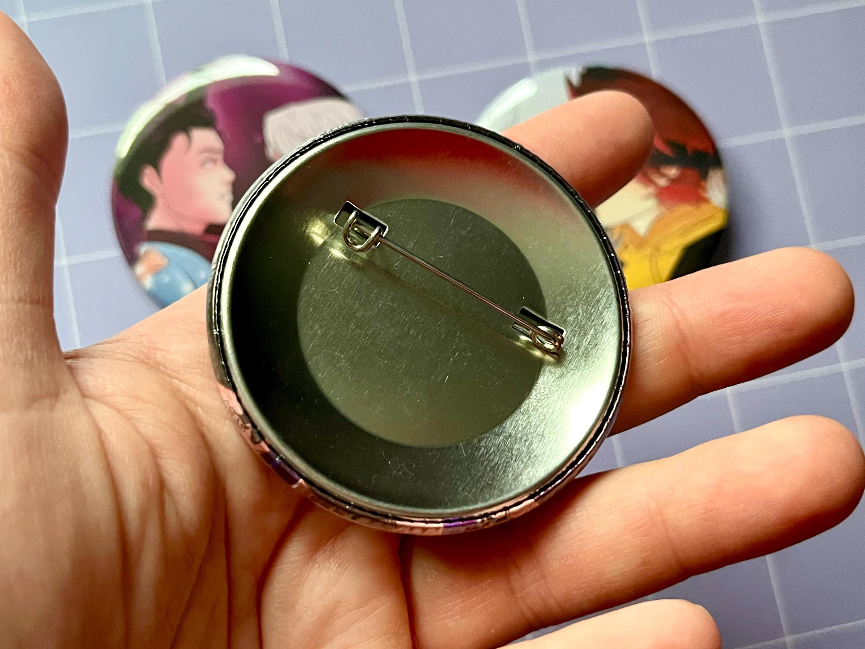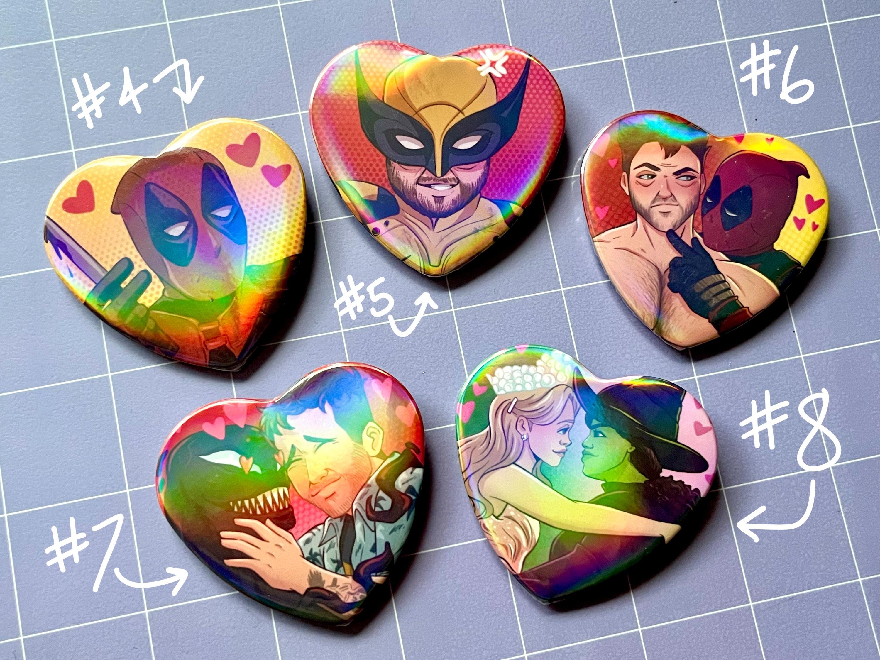 2.25" pin-back buttons featuring artwork of some of your favorite characters and pairings. Round buttons feature a clear, glossy finish. Heart buttons feature a rainbow holographic finish.