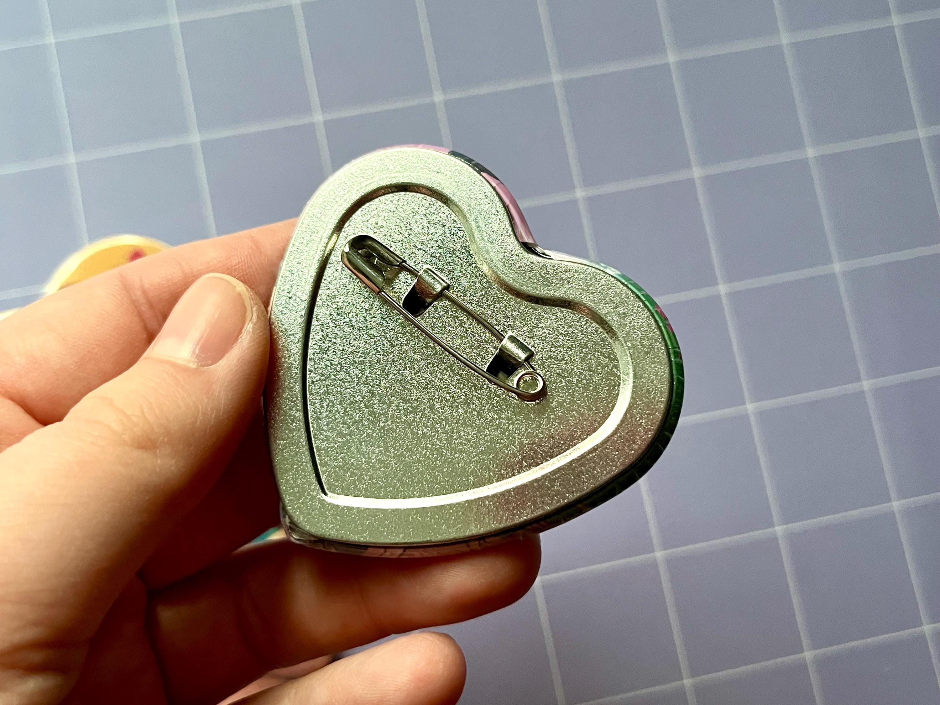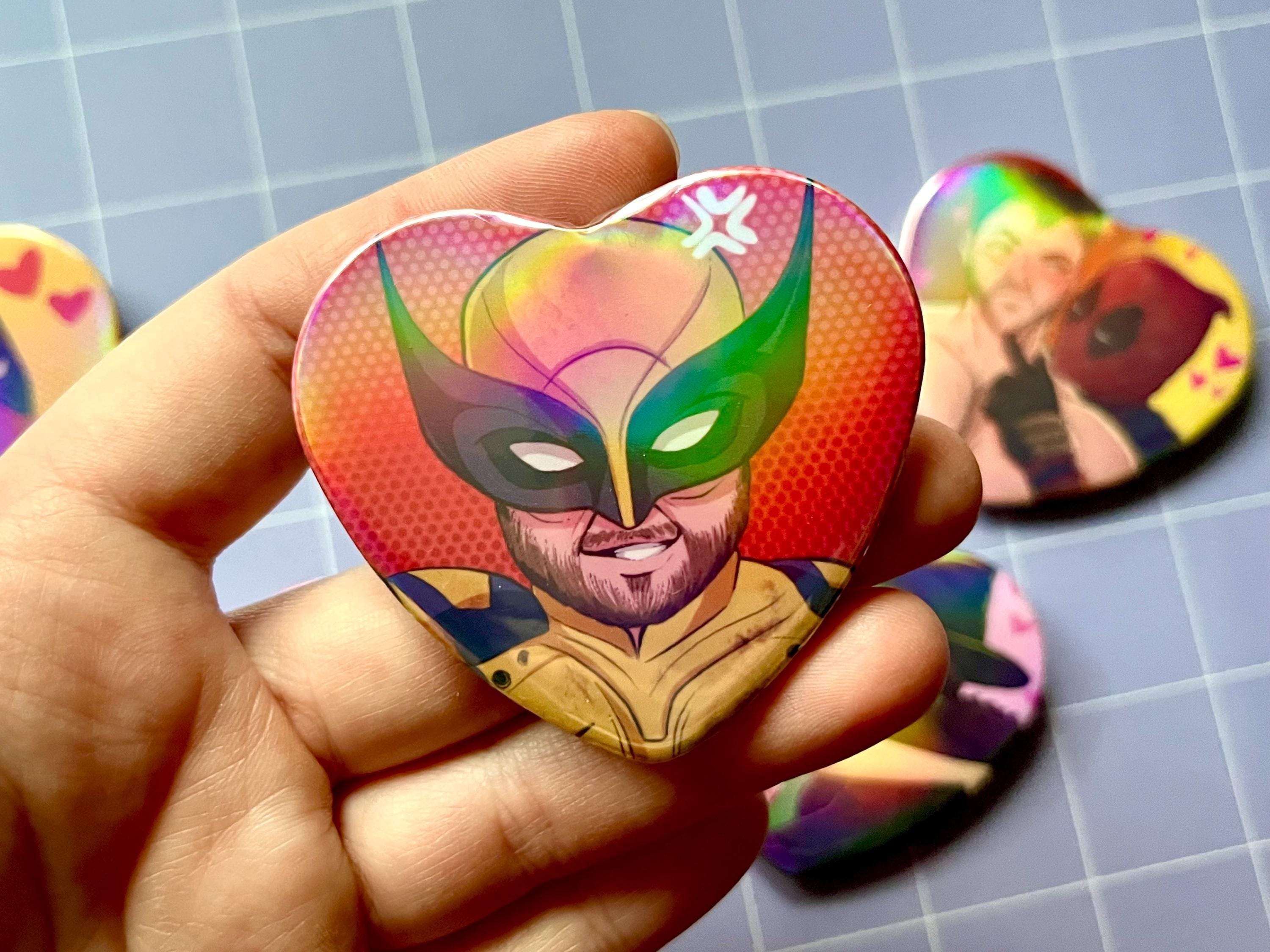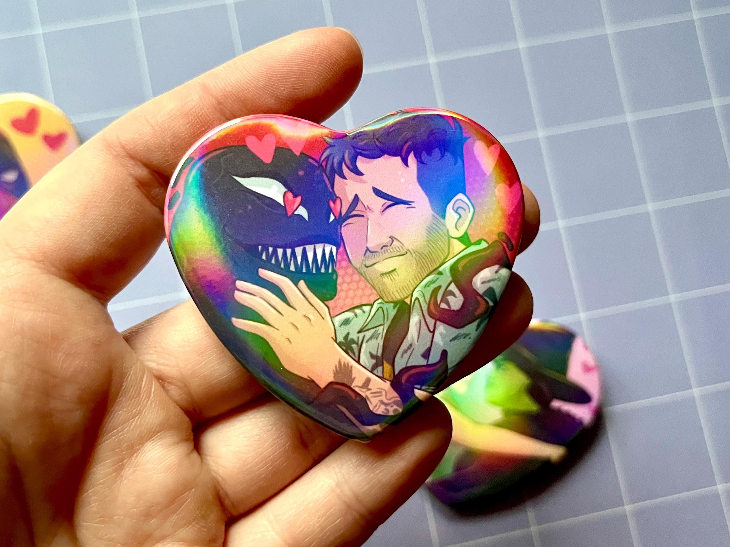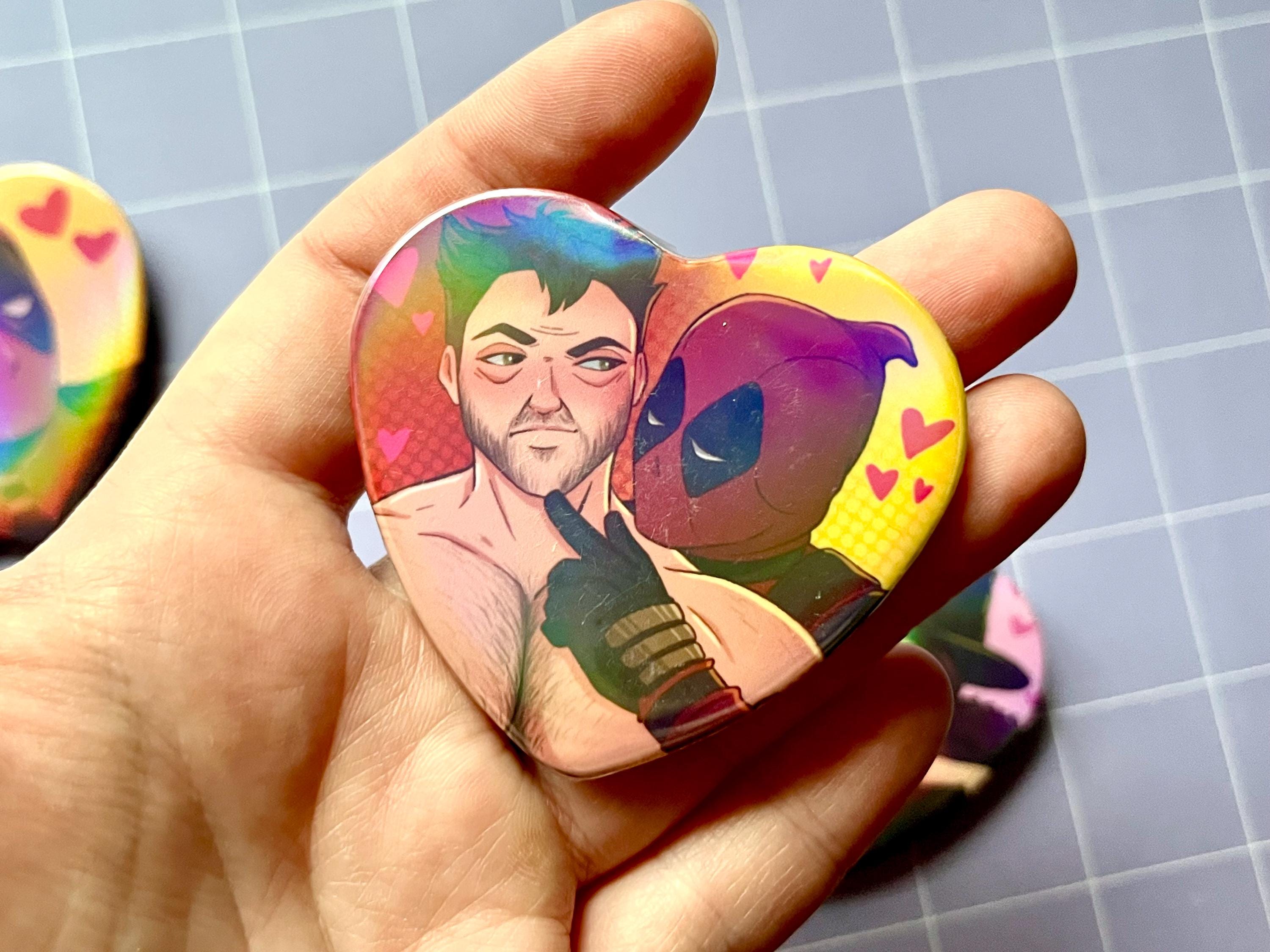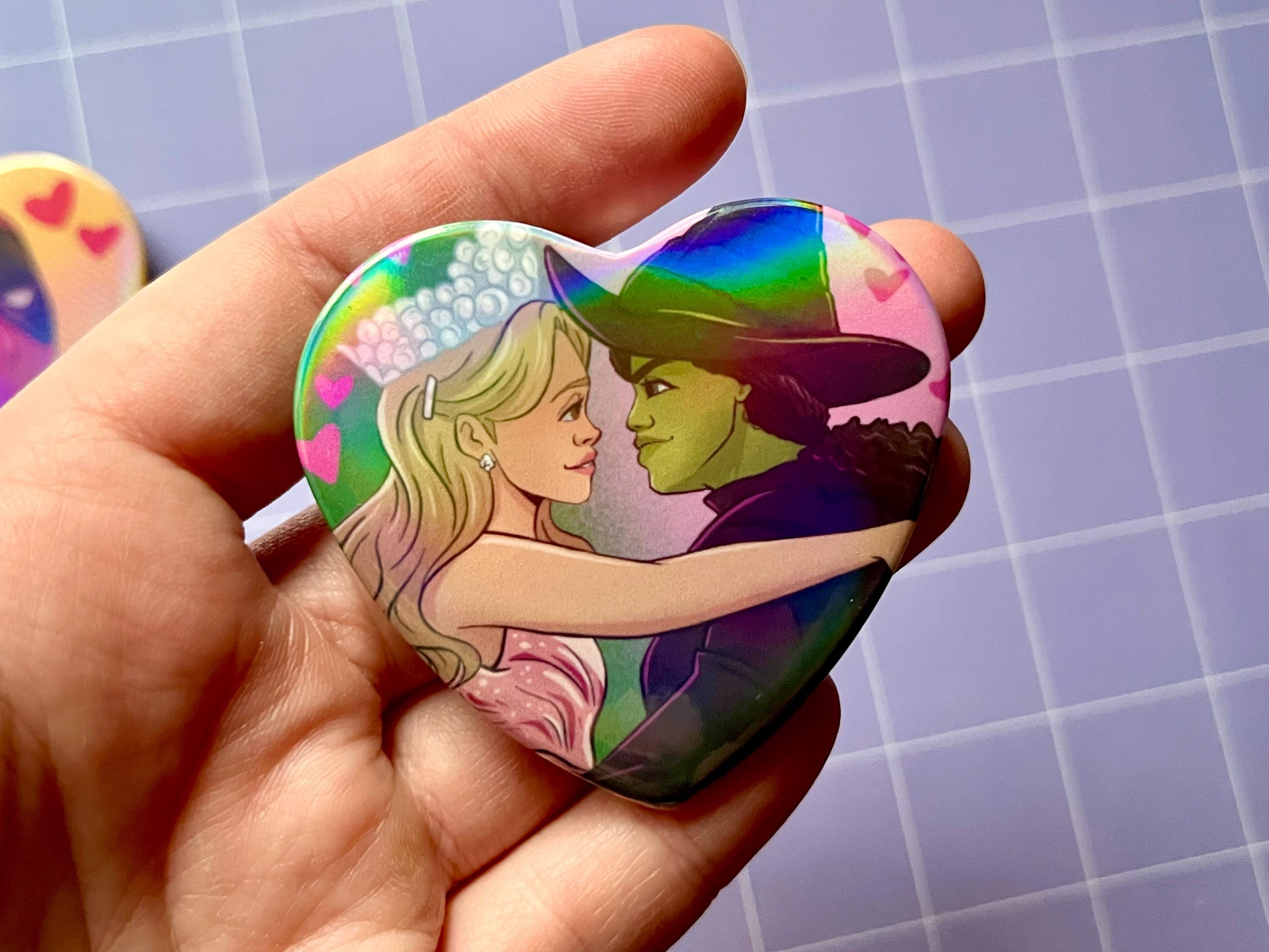 2.25" pin-back buttons featuring artwork of some of your favorite characters and pairings. Round buttons feature a clear, glossy finish. Heart buttons feature a rainbow holographic finish.