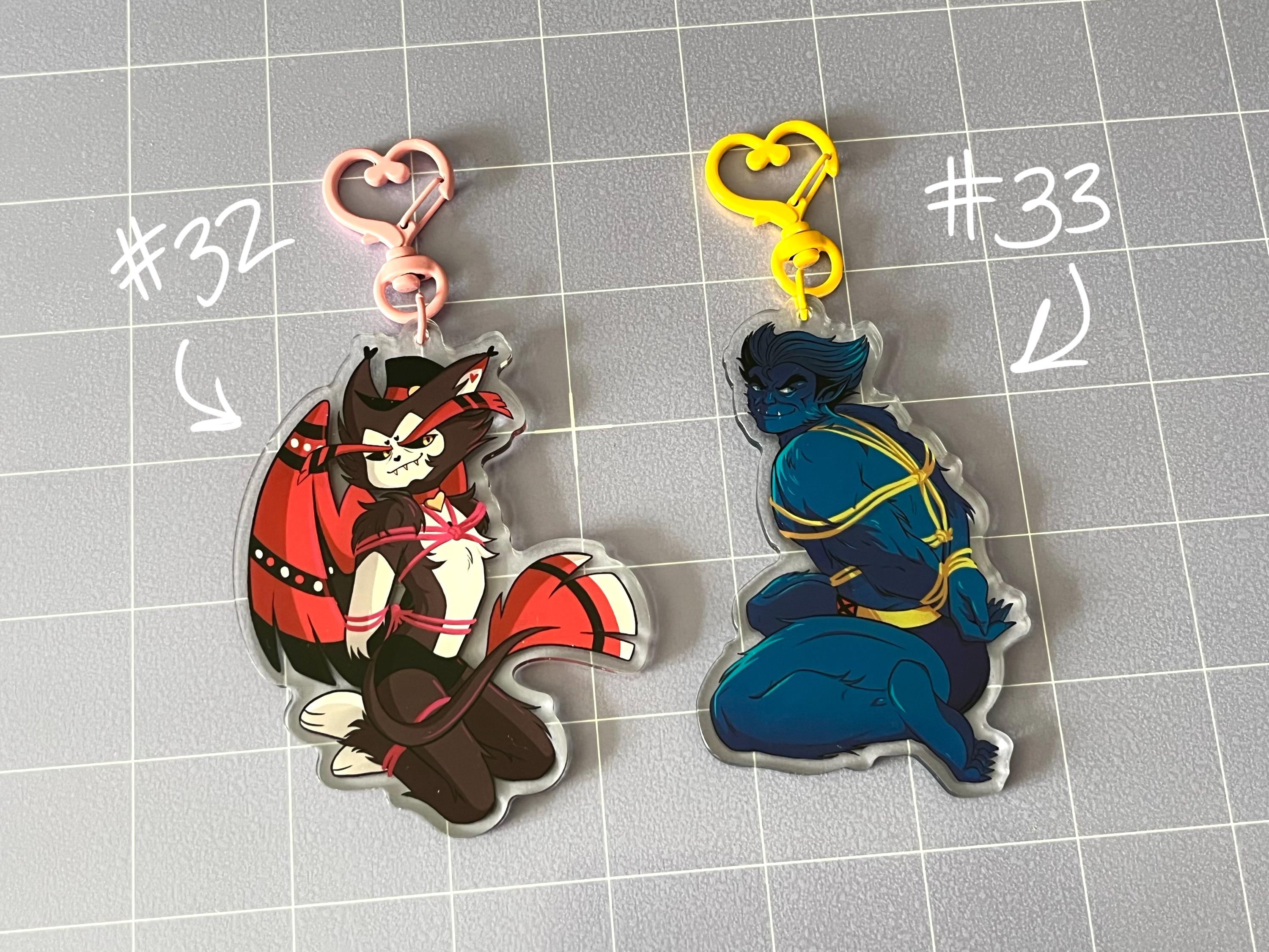 Selection of 3.5" acrylic charm keychains inspired by some of your favorite characters, with a spicy twist! Each includes a heart-shaped clasp attachment. Artwork is printed on both sides.