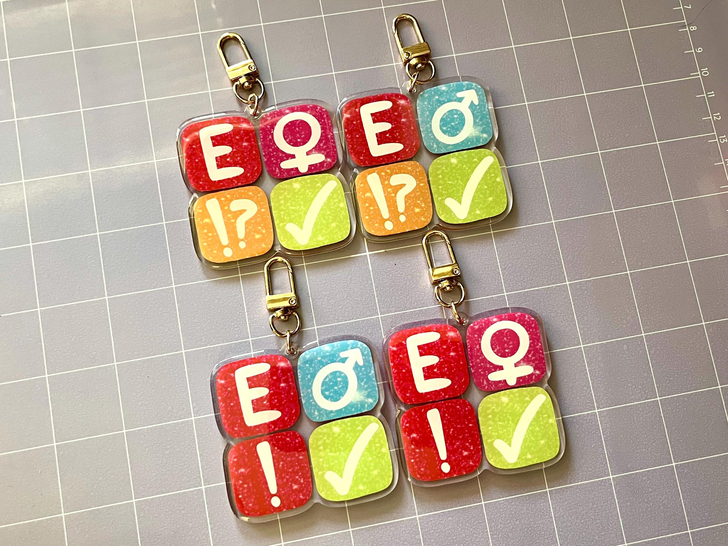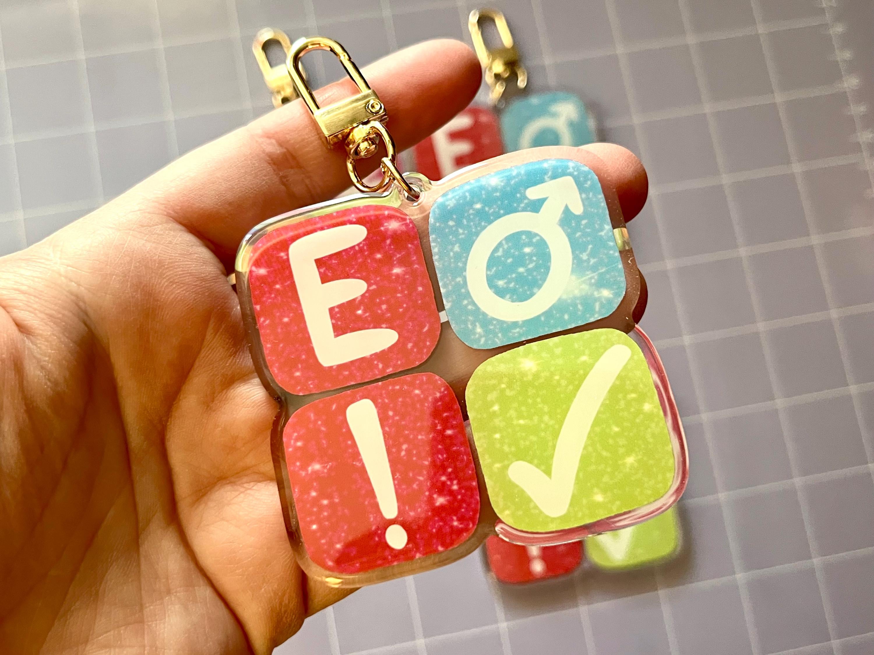 2.5" acrylic charm with a gold-colored keychain clasp attachment. Features a smooth epoxy coating.