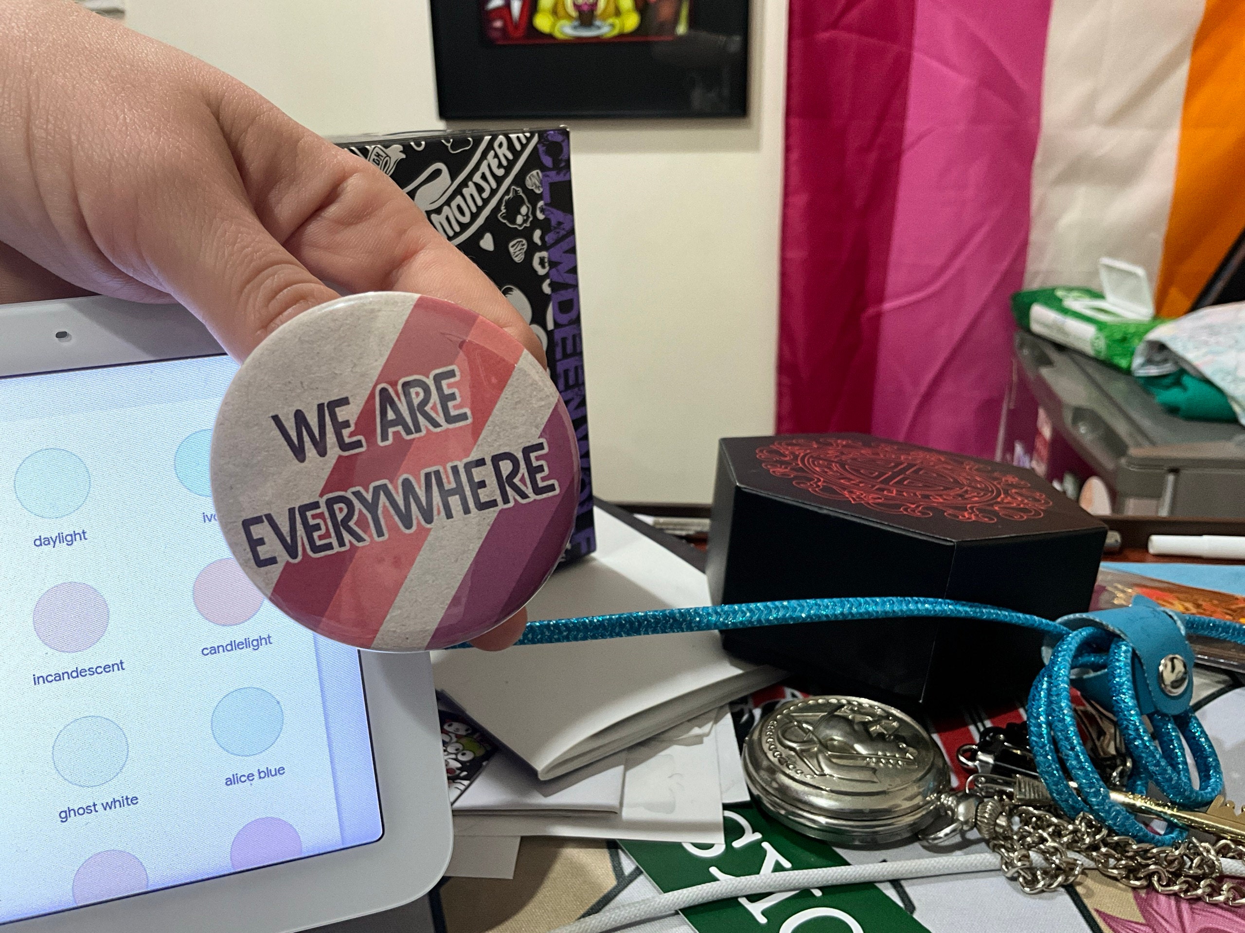 2.25" pinback buttons. Available in the rainbow, gay men, lesbian, bisexual, trans, pansexual, asexual, aromantic, genderfluid, and non-binary pride flags.
