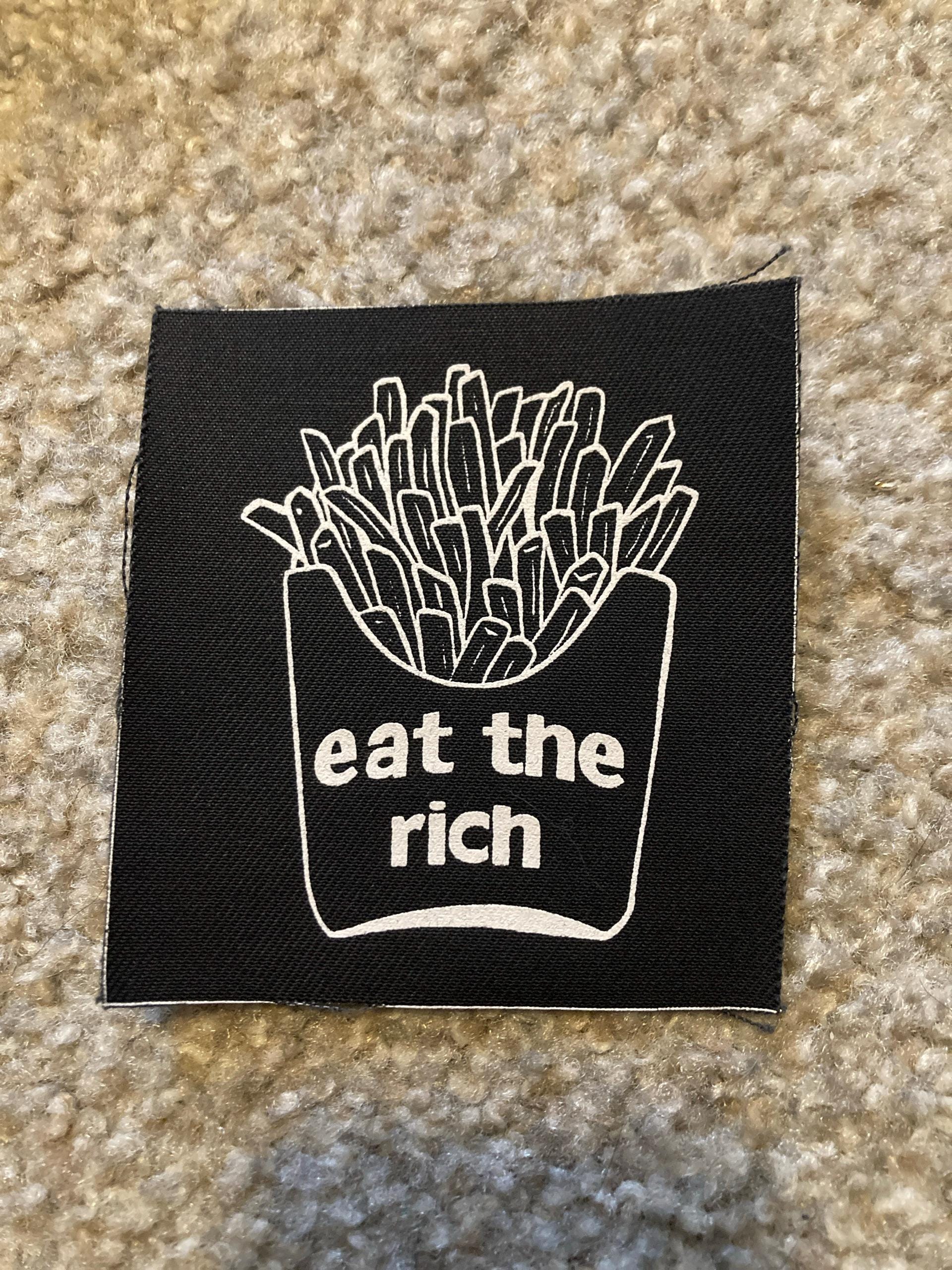 3.5" sew-on patch. Patch is made of medium-heavy black cotton and printed with high-quality plastisol ink.
